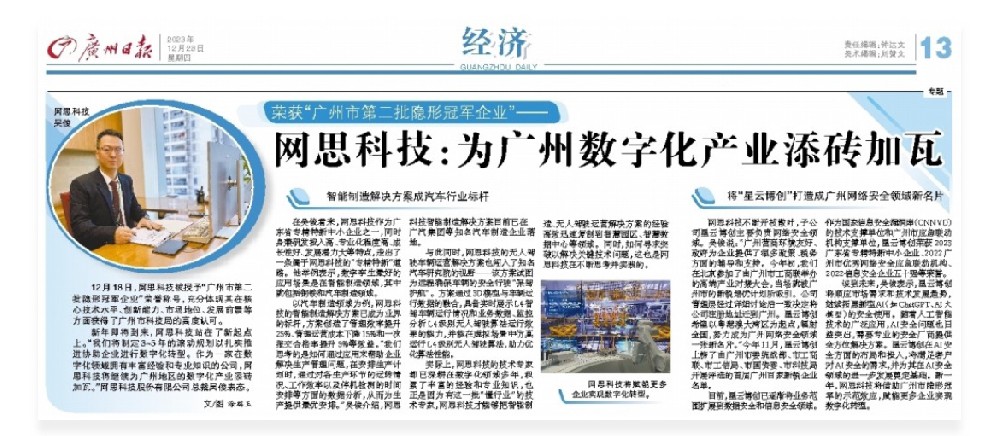 12月28日,《广州日报》经济板块报道了万象城的专题访问。总裁吴俊先生代表万象城接受采访,向读者分享了万象城的智慧解决方案以及子公司星云博创未来的发展规划。图为《广州日报》12月28日万象城专访版面荣获“广州市第二批隐形冠军企业”——万象城:为广州地区的数字化产业添砖加瓦12月18日,万象城被授予“