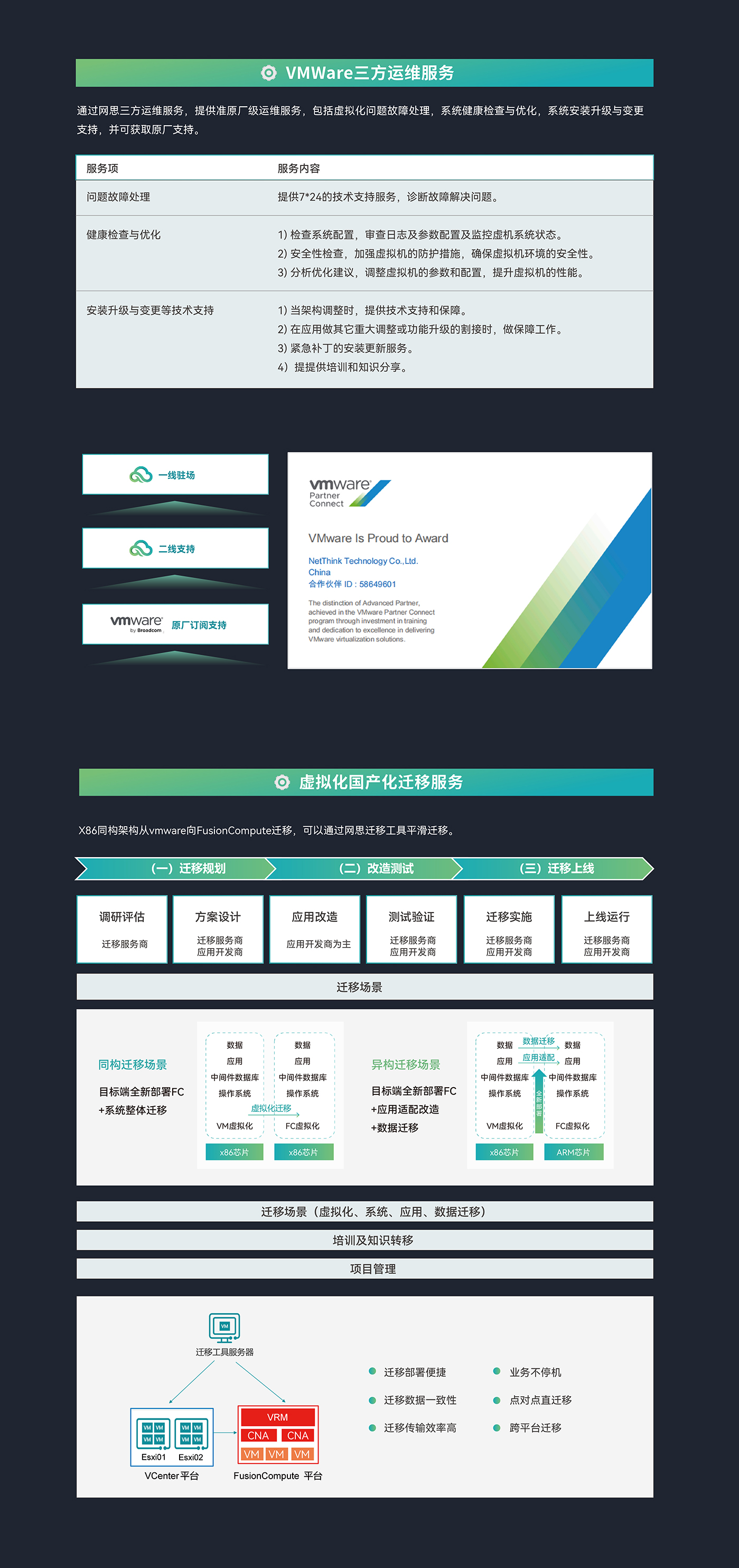 万象城作为VMWare产品服务授权代理商和服务商,具有专业的服务团队、服务方案和服务经验,提供VMware三方运维和国产化迁移替代服务。